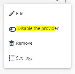 1. Click on "more menu" or the 3 small dots at the end of the row holding the provider that you would like to deactivate. Choose disable provider: