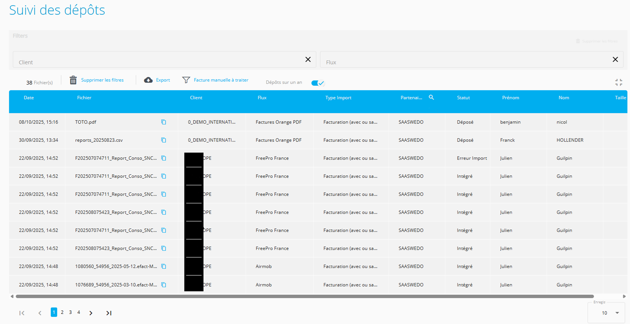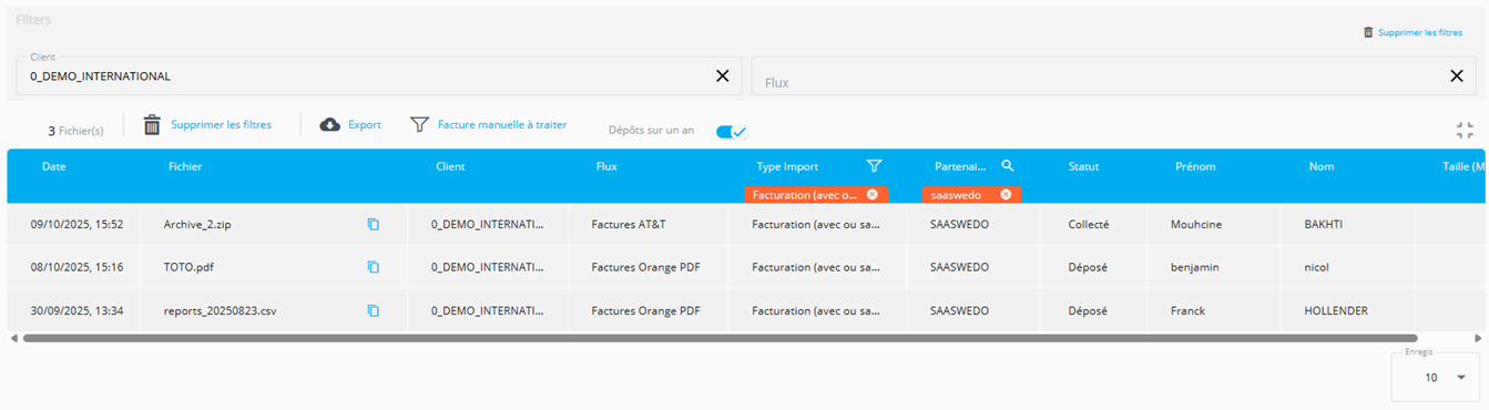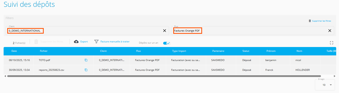 - Les champs Client et Flux permettent de sélectionner une racine client et/ou un type de dépôt (facture opérateur, AOR, …)