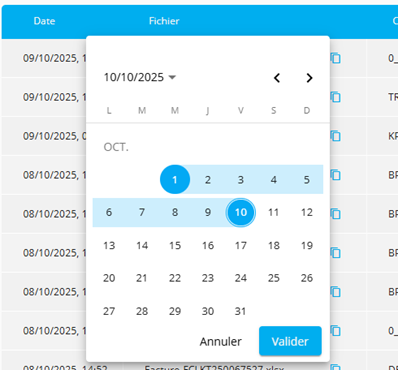 de la colonne Date un calendrier apparait permettent d’effectuer l’affichage de l’ensemble des fichiers déposés entre deux dates.