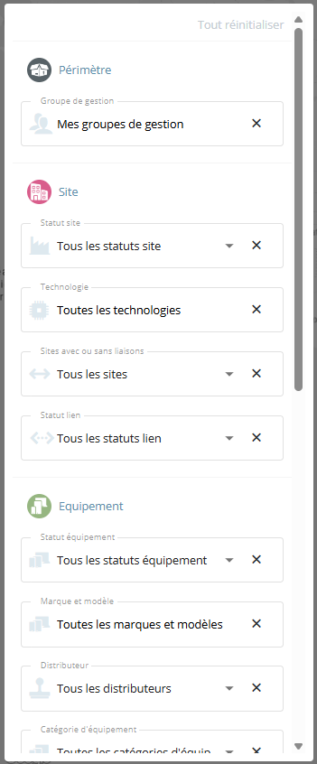 En cliquant sur l'icône des filtres avancés, vous pourrez filtrer les sites affichés par groupe de gestion, mais également en fonction des caractéristiques de vos sites, équipement, ligne collaborateur ou encore carte SIM.