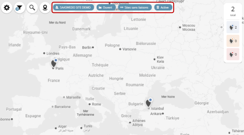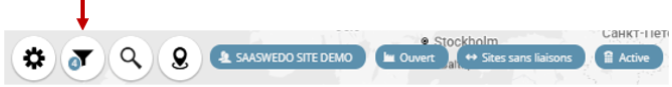 L'application ou modification d'un filtre met à jour dynamiquement la carte (ajout ou suppression de marqueurs, recalcul des groupements, mise à jour de l'indicateur de statut des sites ...)