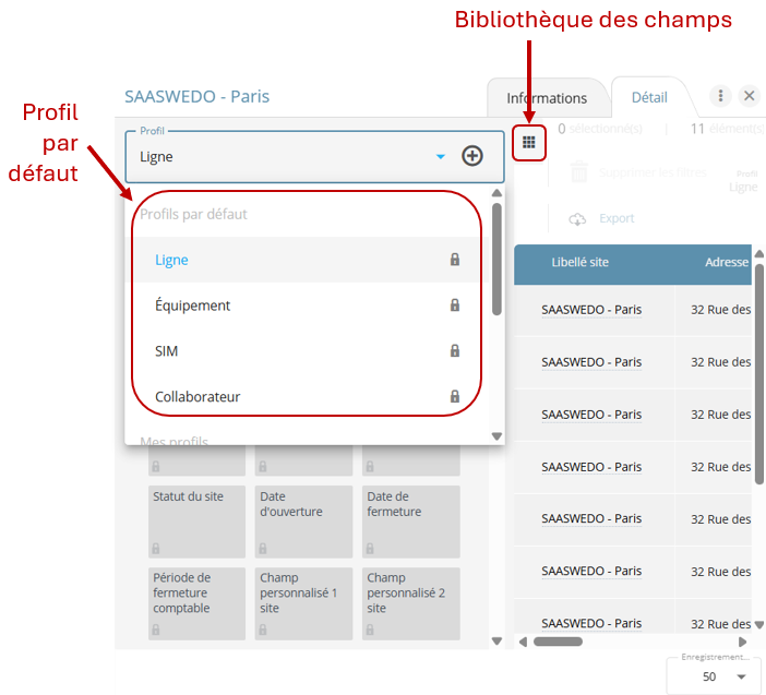 Plusieurs 'Profil" par défaut sont proposés via la bibliothèque des champs pour focaliser les informations du tableau autour d'un type d'objet en particulier :