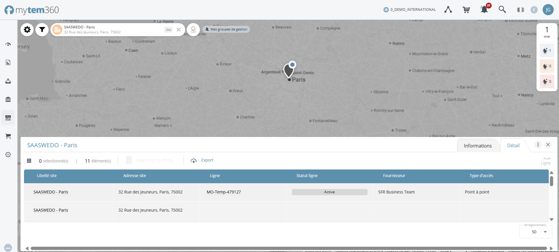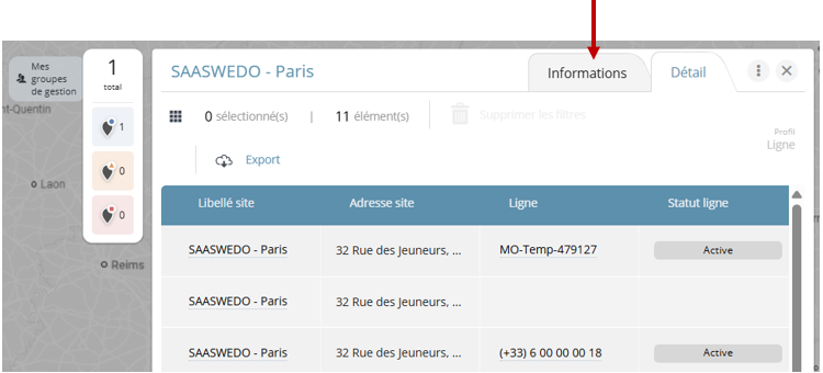 En cliquant sur "Informations" vous affichez directement l'onglet "Informations" du site ou groupement de site correspondant.
