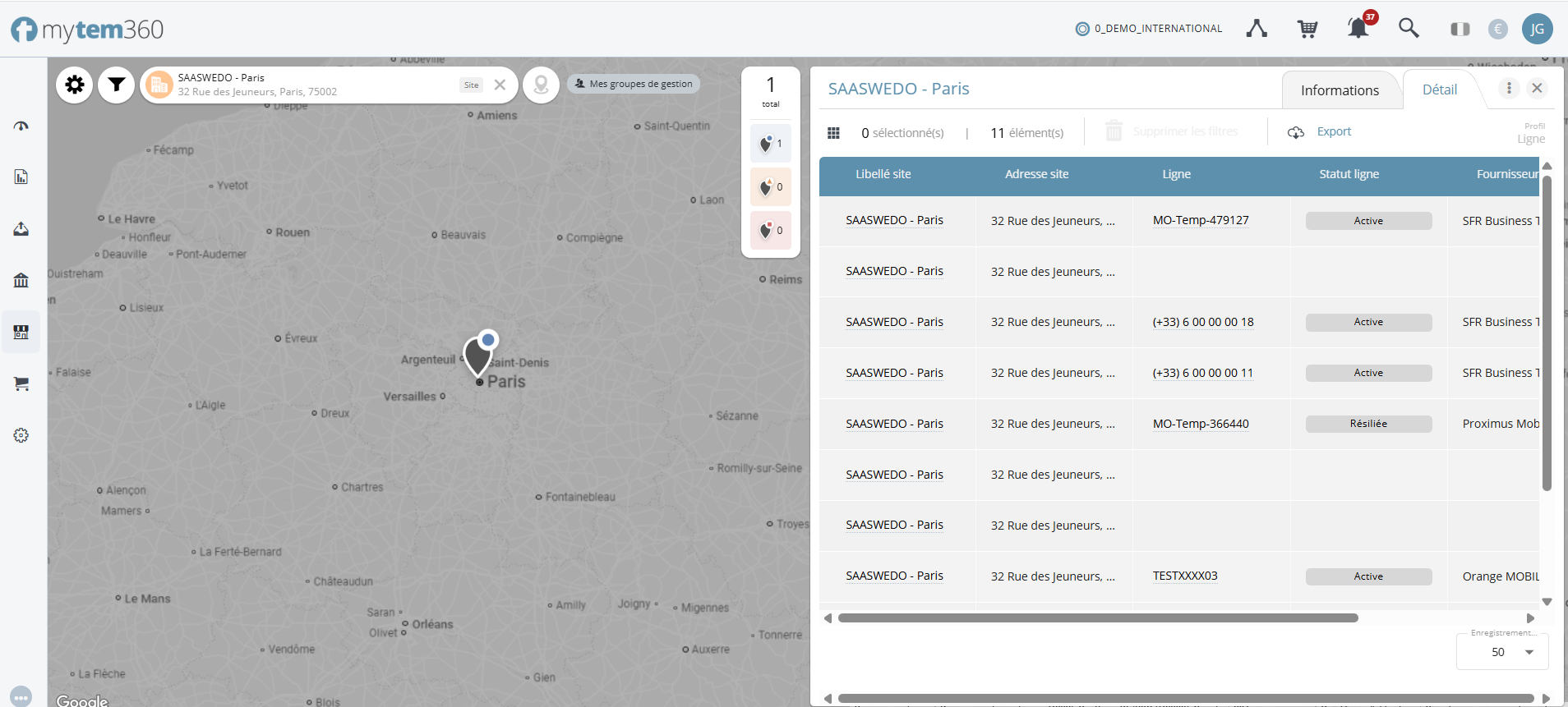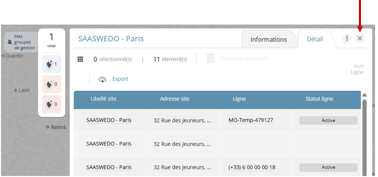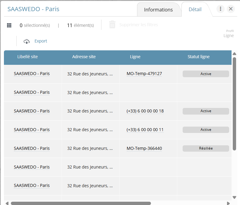 A l'arrivée dans la vue "Détail", un tableau liste l’ensemble des objets associés au site :