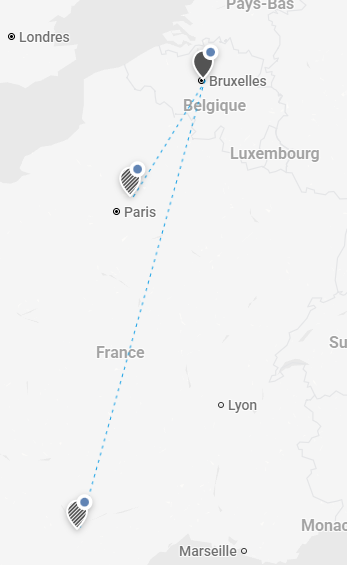 Si le site hébergeant le point B ne fait pas partie du périmètre de la carte, ce site est tout de même affiché avec un logo hachuré pour pouvoir le différencier.