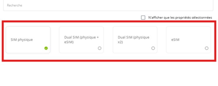 - que la nature eSIM d’une carte sim soit déclarée dans les paramètres de l’outil (Gestion des catalogues -> Liste des équipements disponibles)