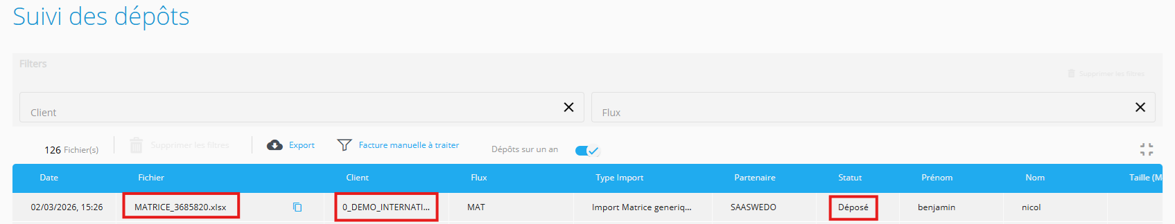 Vous pouvez ensuite suivre le processus d’intégration de votre matrice en allant dans le module Dépôt/Suivi des dépôts de fichiers