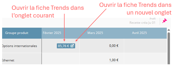 Dans le tableau Trends, dans les champs affichant les coûts, un hyperlien est proposé et permet d'accéder à la fiche détaillée Trends (soit dans un nouvel onglet ou soit dans l'onglet courant).