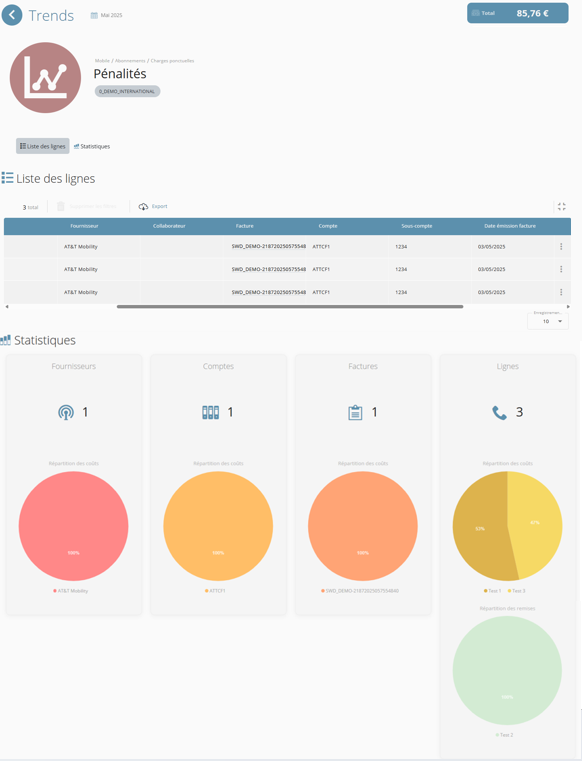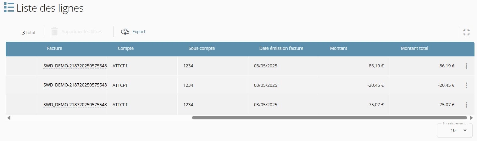 Dans ce tableau, les hyperliens proposés dans les colonnes "Ligne" et "Facture", permettent d'être redirigé par simple clic sur la fiche ligne ou la fiche facture.