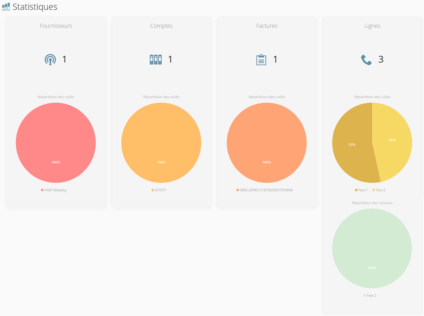 Cette section propose la répartition des coûts et la répartition des remises sous forme de graphes par Fournisseurs, Comptes, Factures et Lignes.