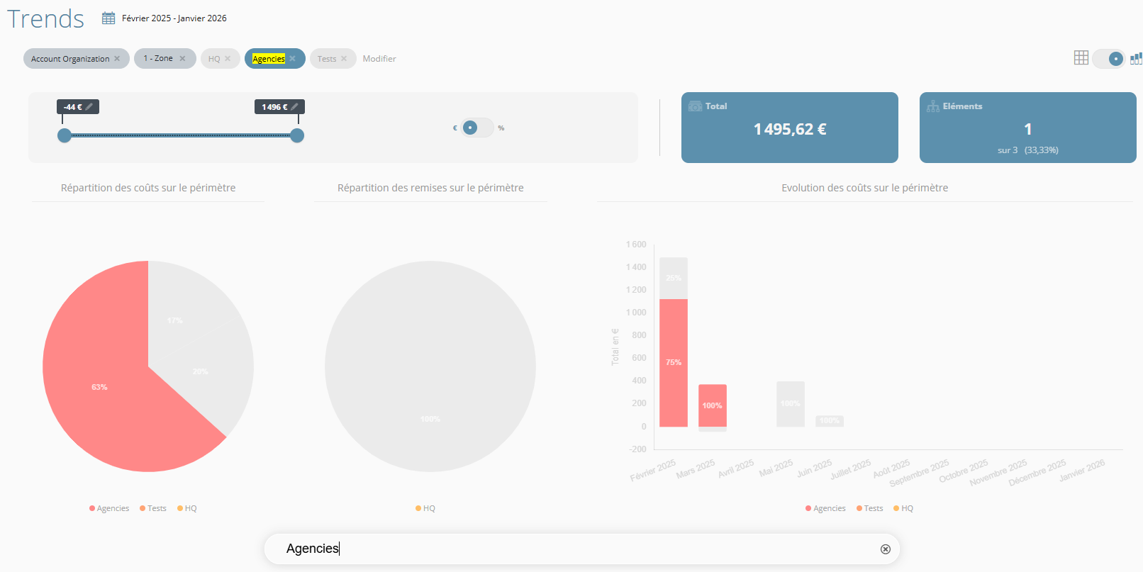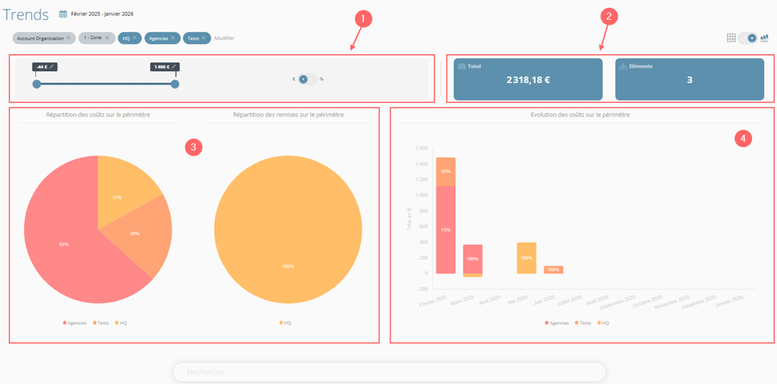 Le slider permet de filtrer les montants affichés dans les widgets et kpi proposés sur la page.