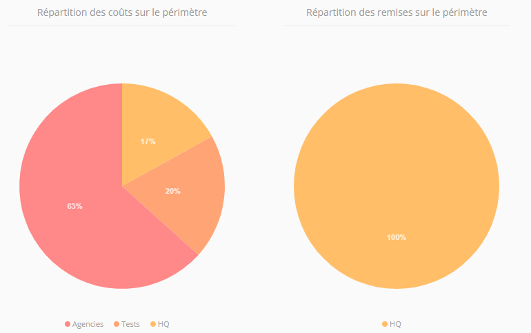 Répartition des remises sur le périmètre (en travaillant avec un diagramme circulaire, il n'est pas possible d'afficher des valeurs négatives. Un diagramme est donc dédié pour les remises, afin de ne pas fausser les pourcentages de répartition)