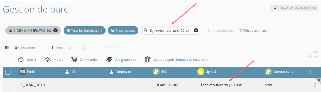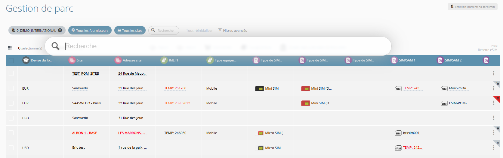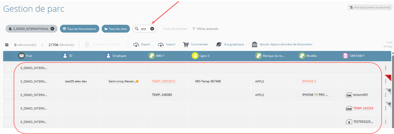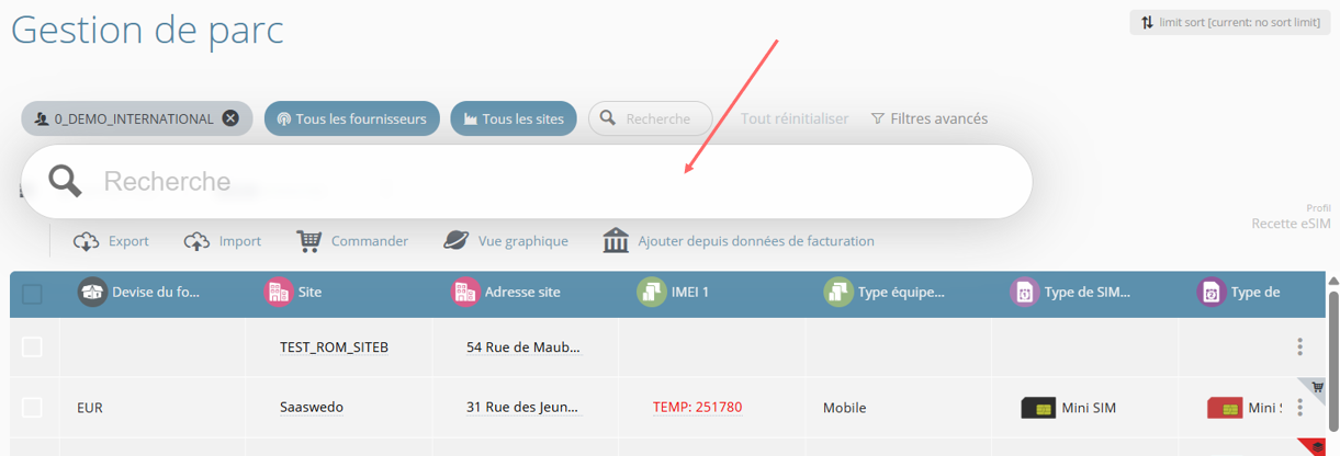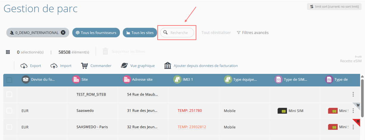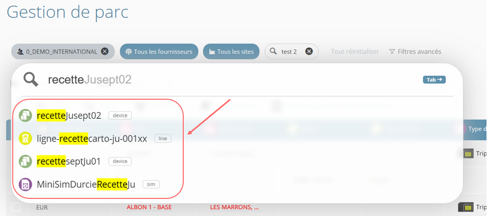 - Les suggestions sont différenciées visuellement selon l'objet proposé (Site, Equipement, Ligne, Sim ou Collaborateur)