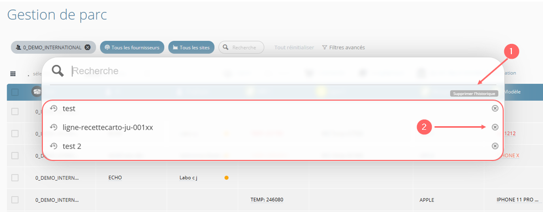 - Les items historisés peuvent être supprimés individuellement via la croix proposée à droite de l'item (2)